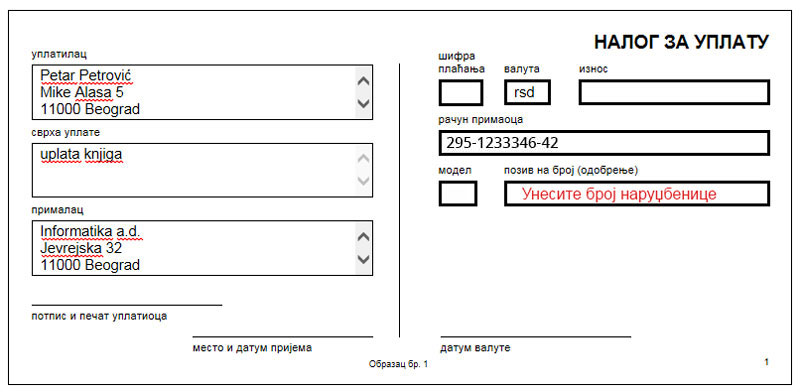 - Poštanskom uplatnicom – iznos za plaćanje knjiga, plaćate poštanskom uplatnicom na naš račun a mi vama šaljemo naručene knjige istog dana po prispeću uplate;